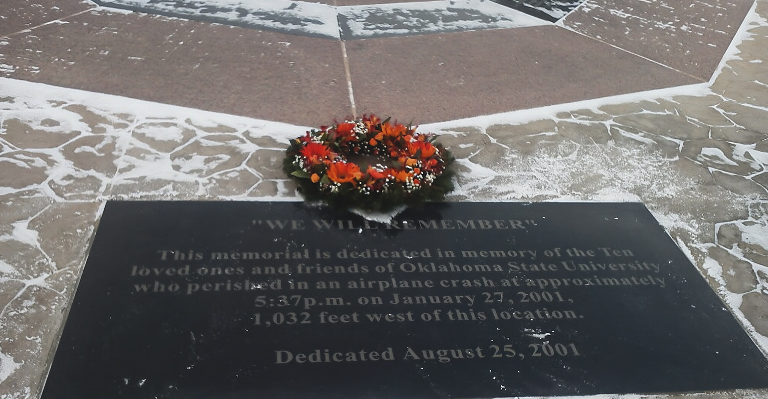 On August 25, 2001, Oklahoma State University President James Halligan and the families of 10 men who died in a January plane crash gathered in a Colorado pasture to dedicate a permanent memorial.
